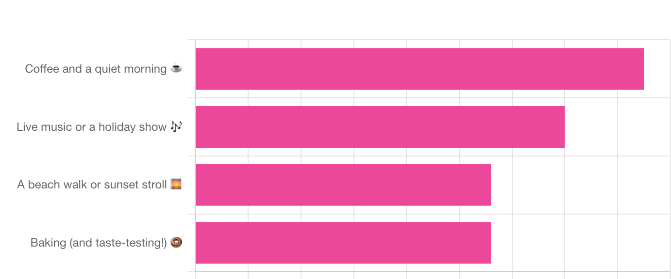 Coffee and a quiet morning ☕ took the lead with 32% of the votes! There’s something meditative about a morning coffee ritual and a slow start. For me, baking is my favorite way to unwind, so long as I can keep the kitchen to myself!