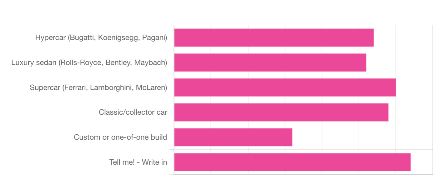 Write in lead with 20% of votes, followed by Supercars! Our readers have very specific tastes and ideas about their dream car, which I love hearing. Here are some favorites: