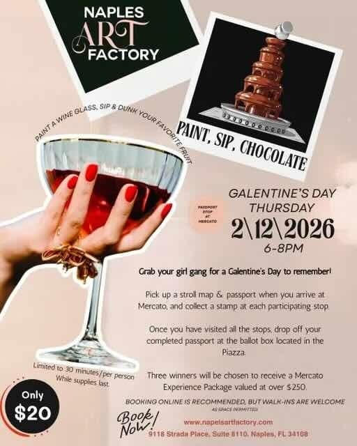 Mercato has a full Galentine’s celebration with complimentary cocktails and sweet treats, Marco Island hosts an art walk along the bay, and an Eagles tribute band comes to Arts Bonita. No Valentine’s Day plan? Dance your heart out at The Cove’s Bachata Bash.