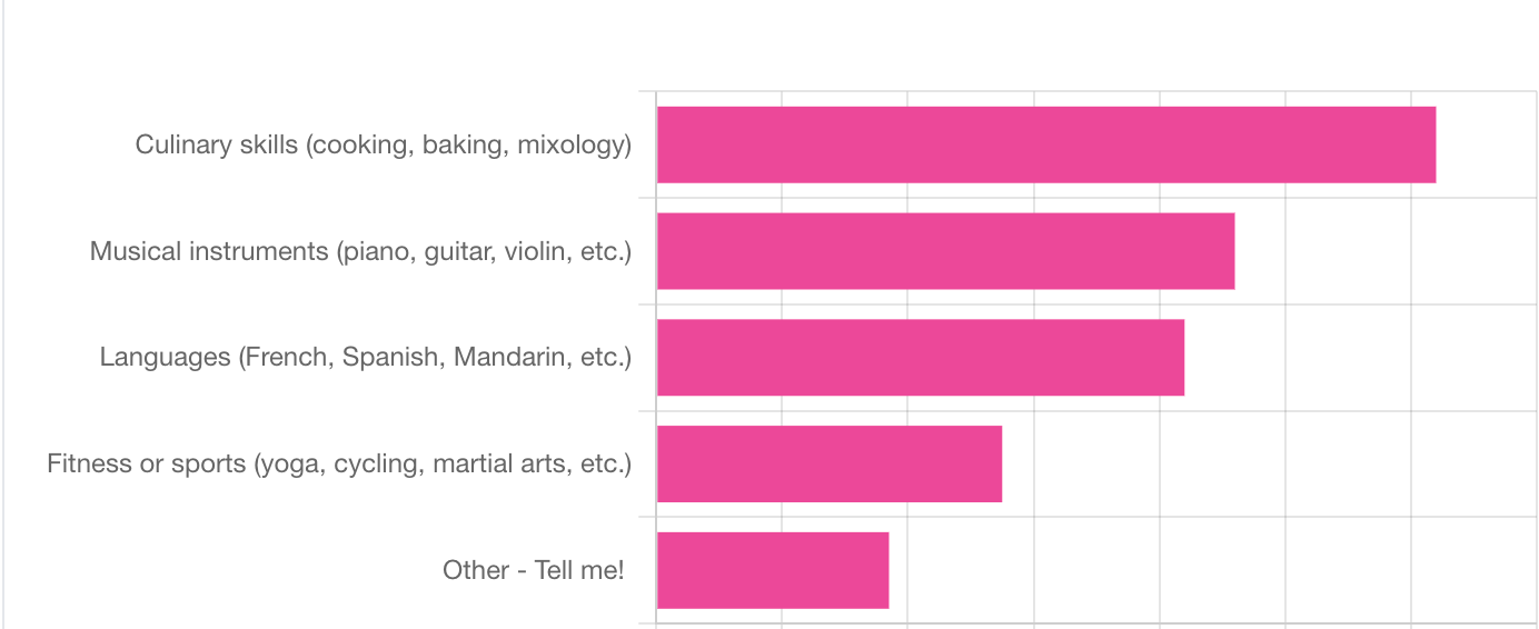 Culinary skills came out on top with 32% of the votes! I often see cooking classes and demonstrations around town, so I’ll be sure to feature those when I find them. Readers shared they wanted to master Knitting & Crochet, Violin, and Italian. Personally, I just took my first jazz piano lesson, a good reminder that it’s never too late to try something new!