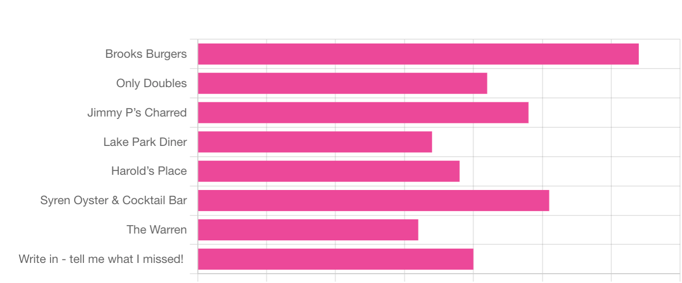 Brooks Burgers leading with 18.34% of votes, followed by Syren Oyster Bar with 14.6% of the votes. Here’s our reader ranking: